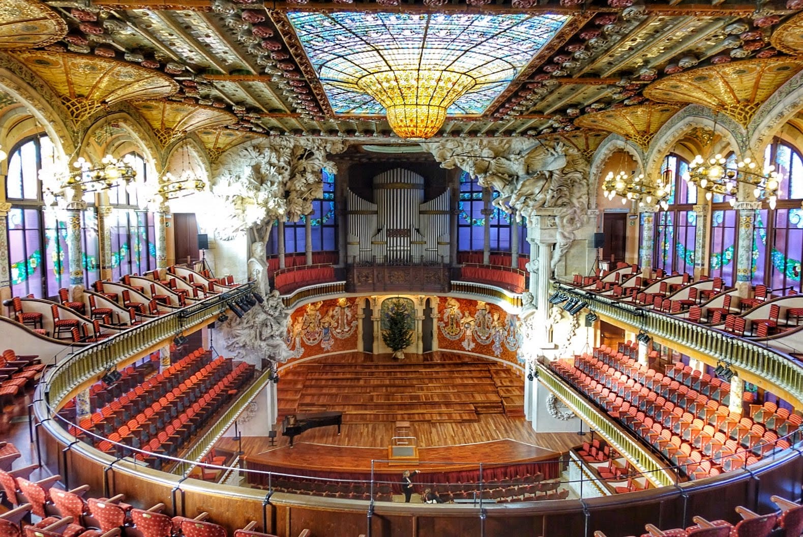 吃飽飯後步行至加泰隆尼亞音樂廳Palau de la Música Catalana,我們參加的是英文tour,是現場直接買票,前面會放一小段影片介紹後人音樂家在這座音樂廳裡的表演,建築本身是多明尼克式建築(Domènech),是高第的師傅,都崇尚回歸大自然,讓一切事物有了自己的曲線,當然無庸置疑高第是發揮的更淋漓盡致,所謂長江後浪退前浪。
